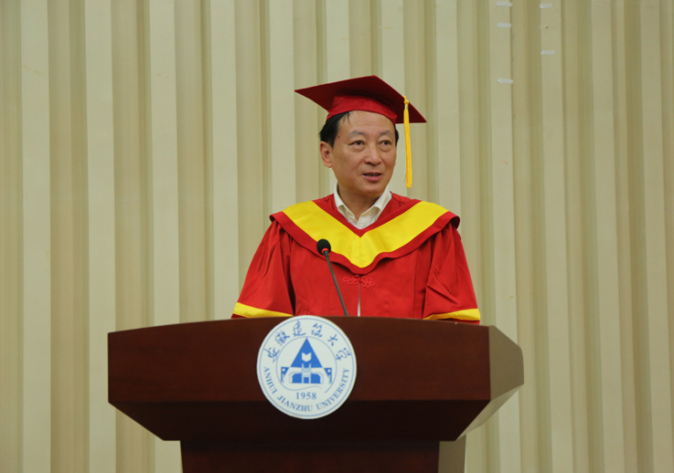 蔡新立代表学校讲话,他向圆满完成学业的2022届毕业生表示热烈祝贺,向所有为同学们成长成才付出心血的父母、师长,致以崇高的敬意和衷心的感谢,他以大学长的身份从自己在建大求学的青春岁月出发走进同学们的青春当下,与大家一起深情追忆在母校学习生活的美好点滴和成长道路上的人生感悟,同时勉励同学们在未来人生道路上保持勤学善思的状态、保持向上生长的姿态、保持乐观积极的心态,树立追梦圆梦的志向、坚定笃行不怠的脚步、成就自信自强的人生!