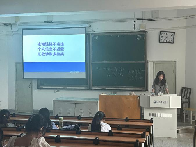 最后,辅导员通过PPT宣讲、观看视频等方式向学生传授预防诈骗、自我保护的方法,要求学生牢记未知链接不点击、个人信息不透露、转账汇款多核实等防骗原则,做到防范于心、反诈于行。