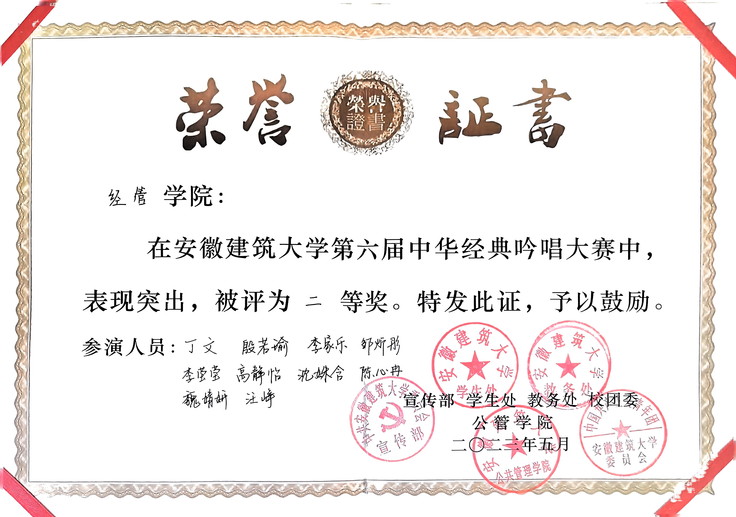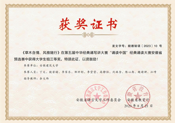 学院深谙中华优秀传统文化对于青年成长的重要性,将其作为思政教育的重要源泉,通过“菁琯”青年宣讲团这一平台,开展了一系列别开生面的主题宣讲、情景剧、吟诵等活动,让古老的文化在现代语境中焕发新生。在2023年安徽建筑大学第六届中华经典吟唱大赛中,宣讲团凭借原创歌舞诵读节目《草木含情风雅随行》荣获校级二等奖和最佳表演奖,以及省级三等奖,展现了传统文化的独特魅力。2024年至2025年,宣讲团又以原创情景剧《秋风秋雨愁煞人》和《清风千年》成功蝉联校级一等奖,不仅展现了传统文化的独特魅力,更在实践中加深了学生对传统文化的理解和认同,实现从“古籍诵读”到“文化转译”的实践升级,为学院思政教育奠定了坚实的文化基础。
