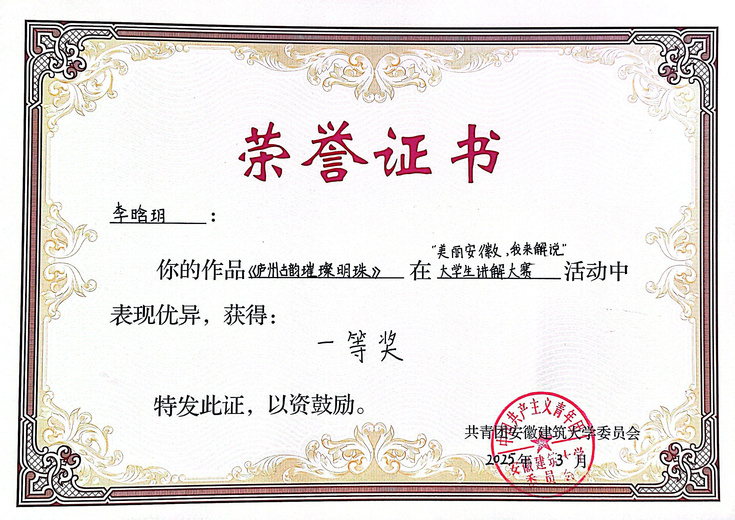 在2025年“美丽安徽我来解说”大赛中,李晗玥、余书然、任雨、王圣斌、李金金五位同学更是凭借出色表现勇夺一等奖,周逸昕获二等奖,徐海波等五位同学获三等奖,为宣讲团再添光彩一笔。正如团队成员在赛事阐述中所言:“我们站在徽州古村落的天井之下,不仅看见飞檐斗拱的建筑美学,更解码出‘四水归堂’所蕴含的聚财守德、耕读传家的现代伦理价值。”这种将地域文化基因与社会主义核心价值观相衔接的实践,使传统文化成为滋养青年家国情怀的“精神根系”。