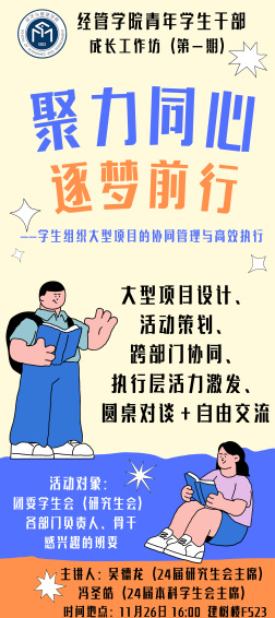 本网讯 为切实提升学生干部的实践能力,进一步夯实团学组织协作根基。近日,经管学院于金寨路校区建树楼523教室精心组织开展了青年学生干部成长工作坊系列活动第一期“聚力同心,逐梦前行——学生组织大型项目的协同管理与高效执行”。此次活动特邀学院24届研究生会主席吴德龙、24届本科学生会主席冯圣浩担任主讲嘉宾,活动由团委学生会(研究生会)承办,吸引了50余名同学踊跃参与。