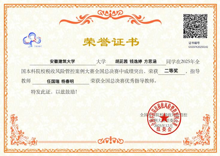 本网讯 近日,由全国税务专业学位研究生教育指导委员会和浙江省注册税务师协会指导,浙江财经大学承办的2025全国本科院校税收风险管控案例大赛全国总决赛圆满落幕。本届大赛共吸引了来自全国31个省、自治区、直辖市的434所高等院校踊跃参与。我校胡茈茜、钱逸婷、方思涵组建的团队代表安徽省,在总决赛中与复旦大学、上海交通大学、浙江大学、中国人民大学等众多强队同台竞技,凭借深厚的专业积淀、精准的风险研判能力与沉稳的现场发挥,荣获全国二等奖,充分展现了我院的教学成果与学生的综合应用能力。