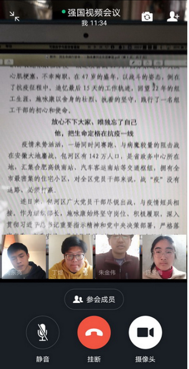 本网讯  患难履使命,牢记爱国心,为加强防控新冠肺炎特殊时期学生党员的思想政治教育工作,增强广大学生党员的责任感、使命感,进一步培养爱国情怀,3月17日下午,环能学院第三学生党支部全体党员通过《学习强国》软件“强国视频会议”功能召开了支部大会暨集中学习,支部书记丁媛媛主持会议。