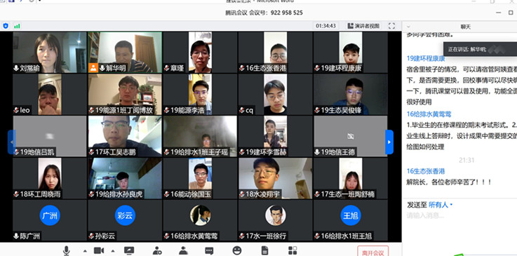 会议由解华明主持,他首先介绍了召开本次座谈会的目的,并请同学们积极发言。各专业学生代表就线上教学方法、课程修读、线上考试、宿舍管理、教材等相关问题提出了意见和建议。