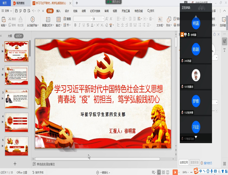 本网讯 为庆祝党的99周年生日,落实学校关于常态化疫情防控“四个一”行动要求,教育引导学生党员做新思想的传播者、新时代的推动者、新征程的奋进者。710日,环能学院学生党支部开展了“青春战“疫”初担当,笃学弘毅践初心”的主题微党课活动。