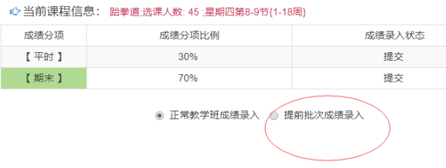 (二)本次成绩录入可分时段录入成绩,授课教师在成绩录入界面点选“提前批次成绩录入”选项,可使用提前批次成绩录入方式。