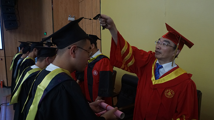 毕业典礼在庄严的国歌声中拉开序幕,环能学院副院长解华明宣读了关于表彰省级、校级品学兼优毕业生的决定,与会领导为获表彰的同学颁发证书并合影留念。副院长朱曙光宣读了授予毕业生学士学位的决定,毕业生依次上台,学校领导、学院领导和教师代表为同学们扶正流苏、授予学位。学院党委书记王媛和教师代表李卫华发表致辞,希望毕业生们能够秉承初心,砥砺前行。2018级建筑环境与能源应用专业刘远航同学代表全院同学对学长学姐们致以诚挚的祝福与美好的祝愿。2017级环境生态工程专业谭小璇同学代表全体毕业生对母校和老师精心栽和悉心指导表示感谢,表示将会谨记“进德,弘毅,博学,善建”的校训精神,用环能人的专业与担当成就辉煌事业。