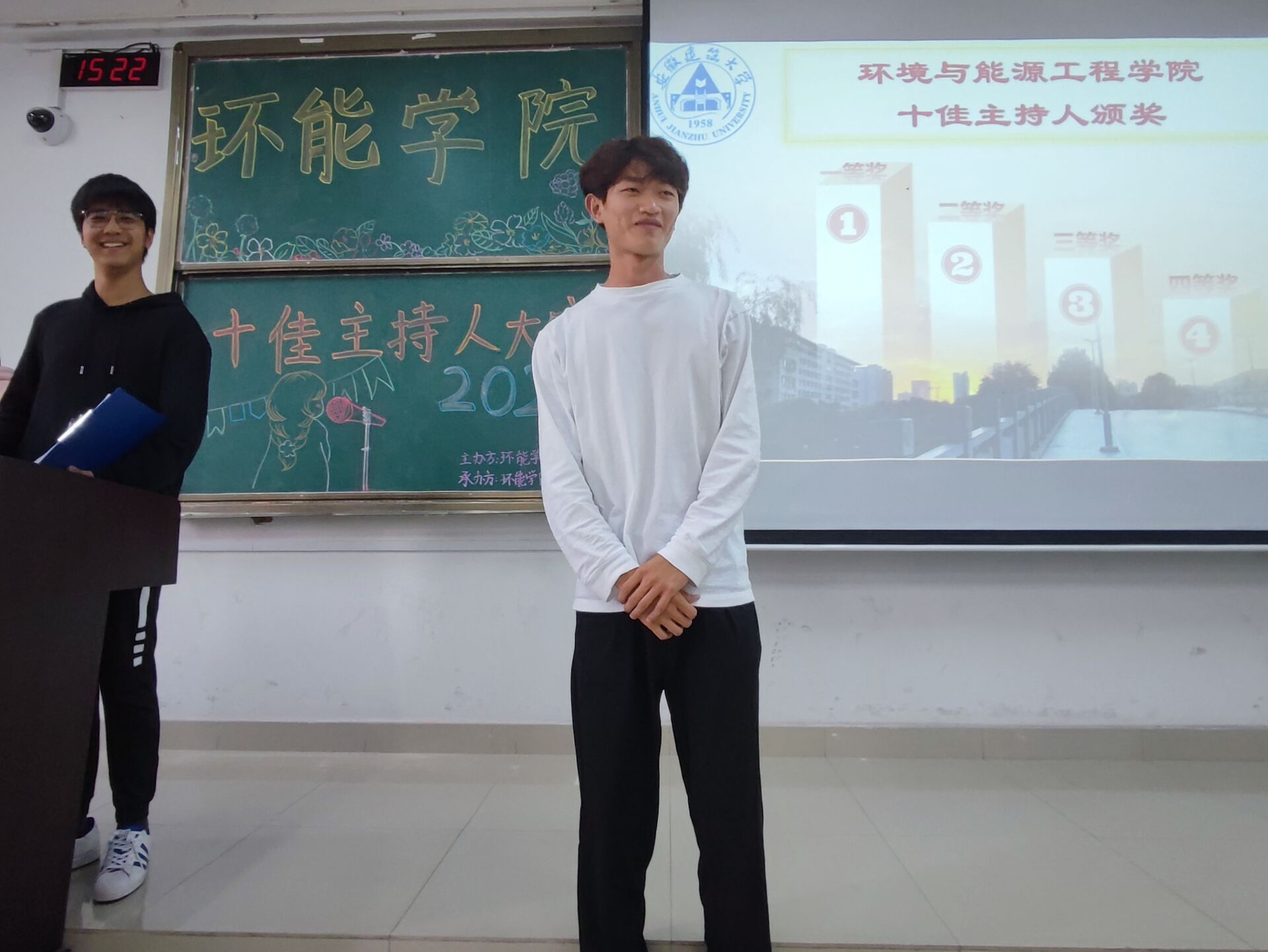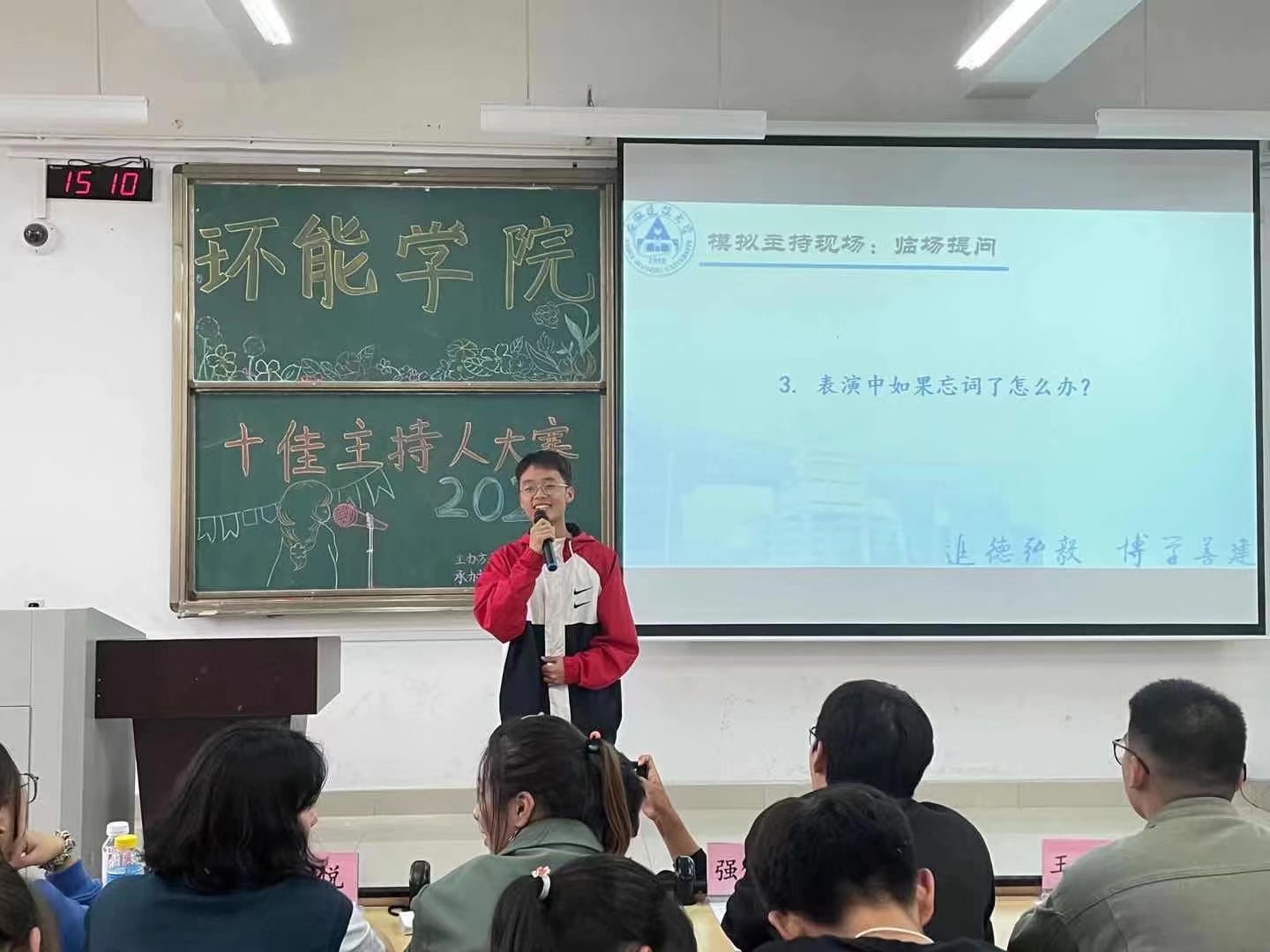 本网讯 为丰富大学生的课余生活,给爱好主持的同学们提供一个展示自我的平台,11月3日下午,环能学院在逸夫楼5201教室举办了“百年恰是,风‘话’正茂”十佳主持人大赛。