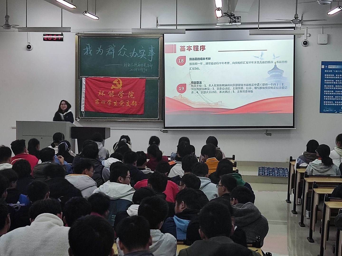 环能学院第四党支部支部委员介绍了学院学生党支部的建设情况,结合发展党员的具体程序与要求展开,详细地为同学们介绍了发展党员的“5个阶段,25个步骤”,并呼吁广大青年大学生积极听党话,跟党走,坚定青理想信念,积极向党组织靠拢。活动最后,支委们耐心细致解答学生们提出的各种问题。