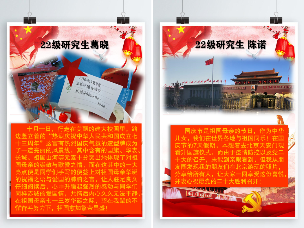 本网讯 十月鲜花吐芬芳,华夏儿女齐开颜,一声祝福献祖国,繁荣富强万世昌!为迎接党的二十大胜利召开,进一步激发研究生党员的爱国之情、报国之志、强国之责,环能学院研究生党支部全体党员通过自己真挚的话语表达着自己对党和国家的美好祝愿。
