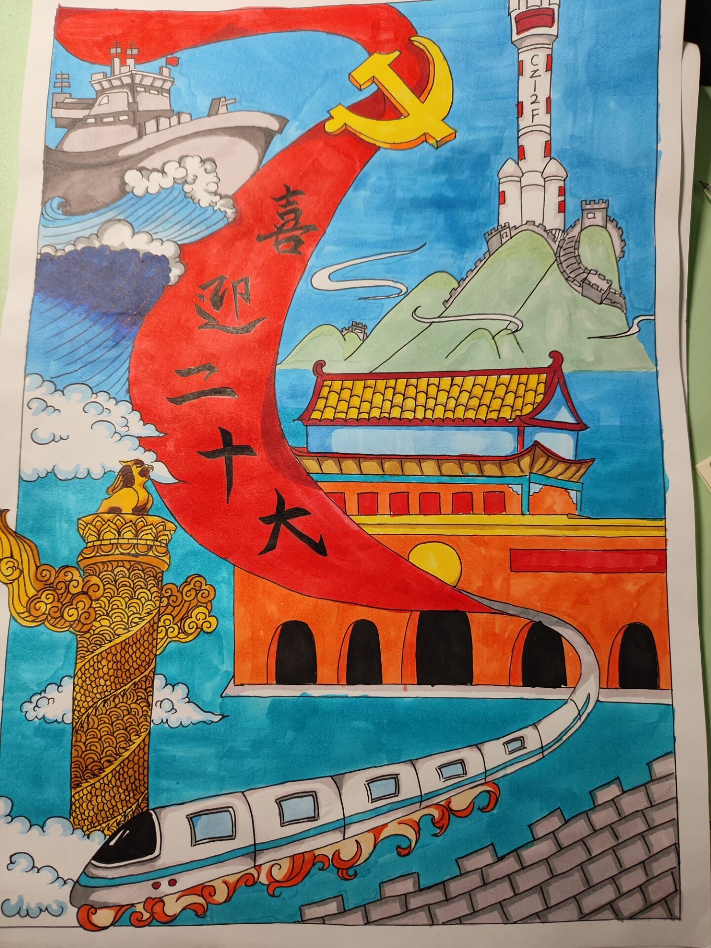 为配合学校疫情防控相关要求,本次比赛全程线上进行。同学们积极参与、潜心创作以书言志,礼赞党的丰功伟绩;以画传情,讴歌伟大新时代。在参与线上评比的14份作品中,和平鸽、祥云等象征着美好意愿的元素跃然纸上,中国版图、人民英雄纪念碑等红色元素层出不穷最终,22级给排水专业的陈芷妍同学的作品绮丽绚烂,获得了环能学子一致好评,在线上投票中夺得桂冠。