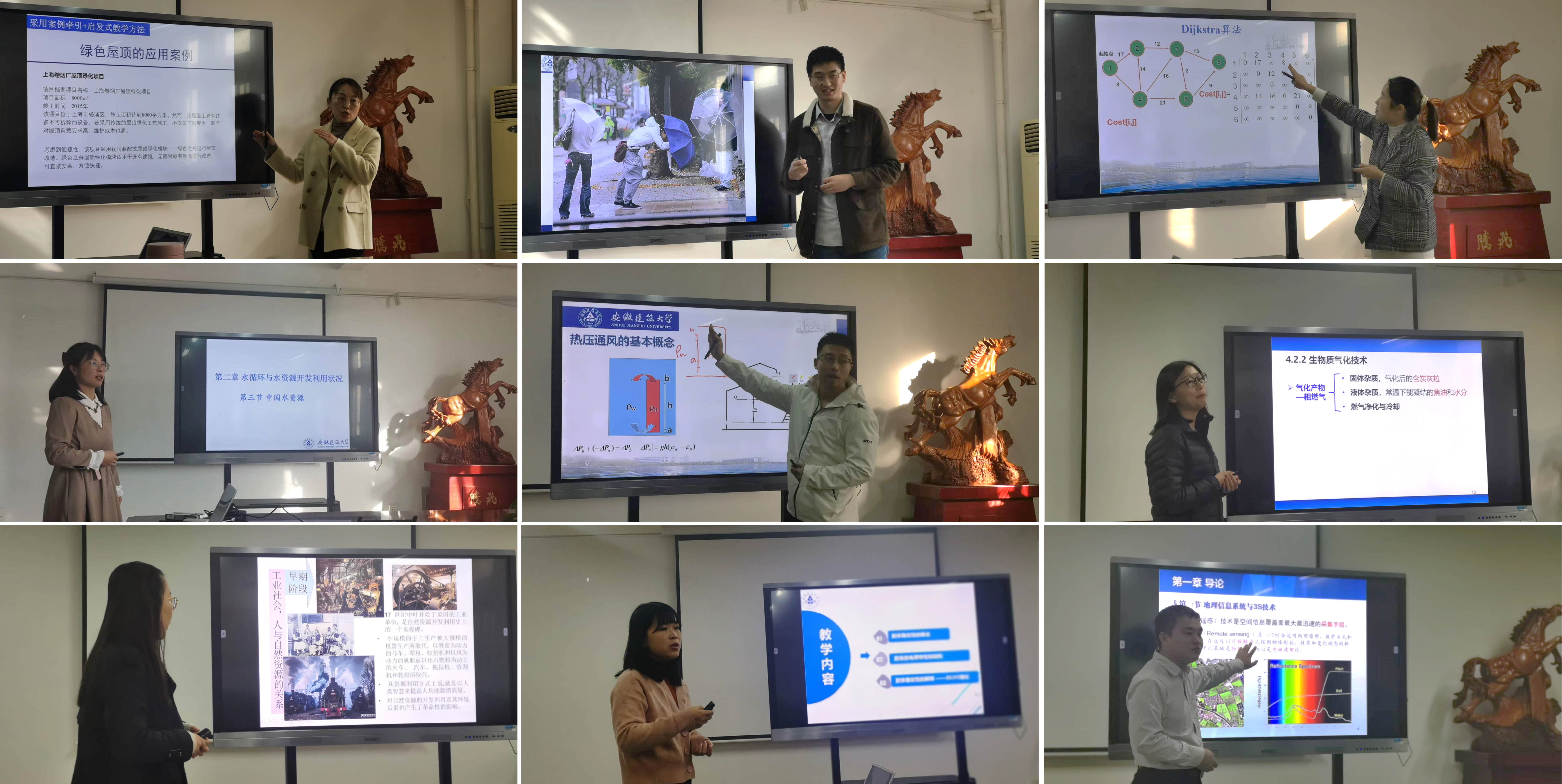 青年教师对此次比赛高度重视,准备充分,各位参赛老师按抽签顺序依次展示教学能力。余丽老师将海绵城市知识点讲解透彻,整个教学过程思路清晰、环节紧凑;张治老师讲授《城市微气候》课程,按照由简到繁的顺序逐步展开知识点,有利于学生对课程难点进行理解;张婷老师利用导航最优路线为引例,深入浅出的讲解了Dijkstra算法;王金花老师风趣幽默的讲解了国内水资源现状等问题,教学过程引人入胜;水滔滔老师生动形象的阐述了《建筑环境学》中热压风压问题,并将自身科研工作带入课堂,教学设计合理,重难点突出,获得评委的一致好评;张萍老师对生物质能源的制备、利用等方面进行了细致的讲解,台风优雅,重点突出;钱婧老师对自然资源学基本理论知识做了全面的介绍,整堂课一气呵成、清晰流畅;赵冰冰老师优雅但不失风趣的对水污染处理中胶体沉降问题进行分析,并与课程思政有机结合,课件新颖生动,授课条理清晰;黄灏老师铿锵有力地对《地理信息系统原理》中的3S技术进行讲述,通过设疑、反问等多种形式引导学生思考,语气抑扬顿挫,教学设计层次分明。