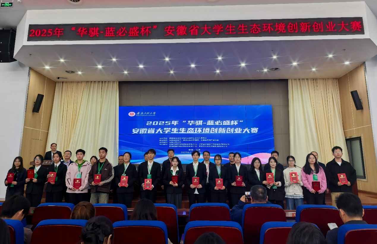 本网讯 11月15日,2025年“华骐-蓝必盛杯”安徽省大学生生态环境创新创业大赛决赛在安徽工程大学成功举办。大赛在安徽省教育厅、芜湖市生态环境局和安徽省环保产业协会的指导下,由安徽省普通本科高校环境类专业合作委员会主办,安徽工程大学承办,安徽华骐环保科技股份有限公司、江苏蓝必盛化工环保股份有限公司、安徽欧鑫环境科技股份有限公司和安徽优环环保设备制造有限公司协办。此次大赛有本科生和研究生两个赛道,分新产品研发、新工艺设计和创意设计三个组别进行,共有来自中国科学技术大学、合肥工业大学、安徽大学等省内24所高校的112支参赛队伍参加决赛。
