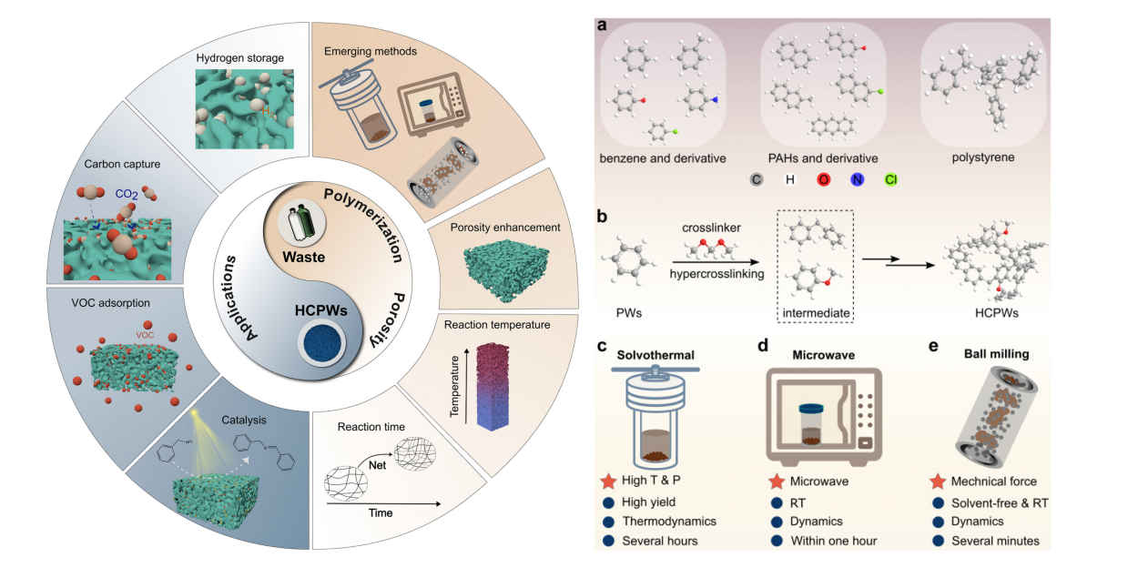 为此,该工作系统总结了该领域进展,明确提出以超交联化学反应为核心的技术框架,重点阐述基于溶剂热、微波辅助与机械球磨等手段的苯基废物超交联实现策略,梳理了其在能耗、时间、产物结构等方面的特点。同时整合了不同来源苯基废物(单环芳烃、多环芳烃、聚苯乙烯等)的转化案例与性能,从比表面积、孔隙结构、应用效能等多维度进行深入比较。该工作进一步展示了苯基废物超交联多孔材料在氢气储存、二氧化碳捕集、挥发性有机物吸附及多相催化等领域的重要应用潜力,并指出当前在比表面积提升、电子缺失型废物转化、工艺放大与经济性等方面面临的挑战。未来,通过开发新型绿色合成策略、推动反应机理研究与工程化放大,有望推动该技术实现规模化应用。