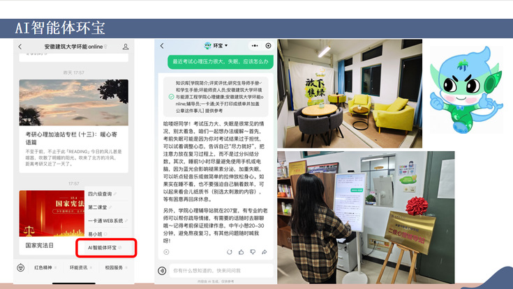 学院团委新媒体中心与二级心理辅导站联手打造考研专属线上陪伴平台,历时数月持续推出26期考研主题推文与短视频。内容兼具实用性与治愈感,既有针对公共课、专业课的冲刺技巧梳理、错题复盘方法分享,也有心理调适小妙招、考前焦虑缓解指南;既邀请往届高分学长学姐分享备考心路与应试经验,也以温情文字送上每日鼓励,用“加油语录”“备考小贴士”“冲刺微视频”为学子打气。同时,引入AI智能体“环宝”,依托学院专业特色与情感计算技术,为学子提供7×24小时心理疏导与个性化支持,成为学子备考路上的“心灵伙伴”。