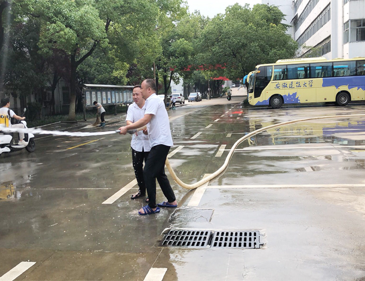 受极端天气影响,今年的汛期时间较长, 7月18日凌晨,合肥地区由于连日大雨和强降雨,造成北校区多处路面、图书馆、教学楼、多栋学生公寓积水严重,校园形成严重内涝,后勤干部职工冒着暴雨,不畏艰辛,始终奋战在抢险救灾一线。面对汛情,校领导第一时间到达现场,在实地察看汛情后,要求集团立即启动防汛应急预案,迅速展开灾情应急处置。集团领导班子靠前指挥,组织指导后勤相关部门人员及驻校物业公司进行防汛排涝抢险救灾等工作,合力迎战强降雨,经过多部门密切配合,协同合作,较短时间内恢复供电、畅通道路、消毒杀菌等工作,确保了师生生活秩序正常。