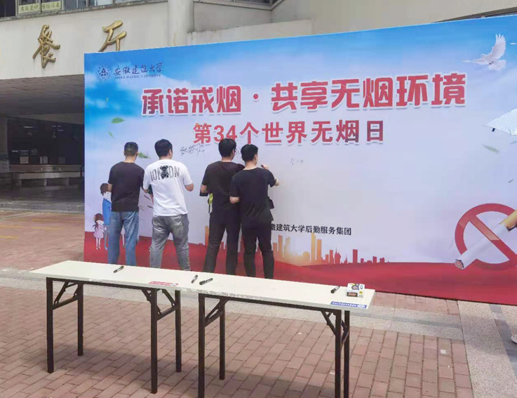 后勤服务集团精心安排,在校园主干道两边悬挂无烟日宣传横幅,在南校区紫云食堂和南苑食堂广场前搭起签名墙,摆放戒烟宣传板,引导来往师生员工参与到签名活动中,得到大家的积极配合和热情支持。