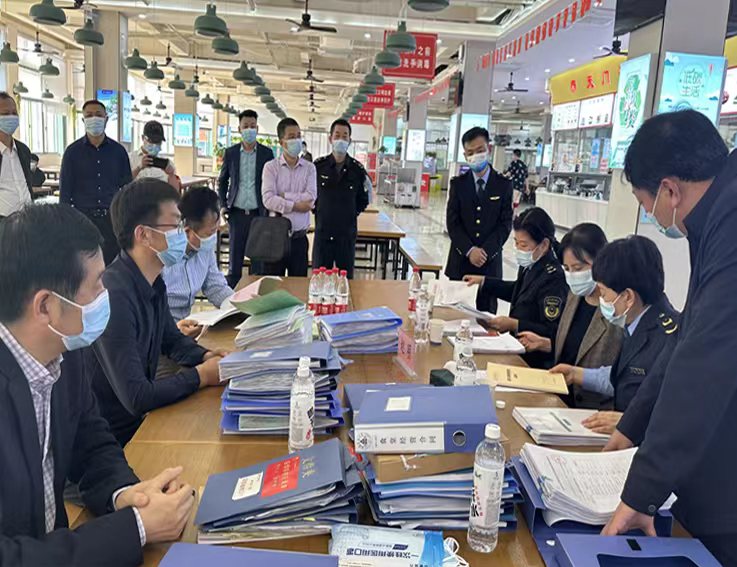 赵明一行深入学校食堂,实地检查食堂环境卫生、从业人员健康证及市场局的季度检查表和营业执照、食品经营许可证等,认真查看了食堂“明厨亮灶”使用情况、食品安全总监、食品安全员任命文件以及日管控、周排查、月调度的台账记录,详细了解食材来源并查验了食堂的原材料进货台账,询问了消费帮扶、疫情期间保供稳价和防疫措施落实等情况。