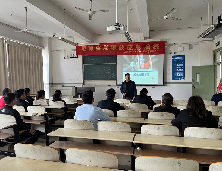 演练开始前,电梯维保人员围绕电梯启停控制方式、电梯事故类型等内容进行介绍,随后详细讲解了此次演练方案,明确职责分工并提出注意事项。