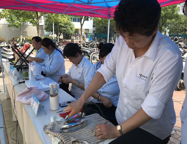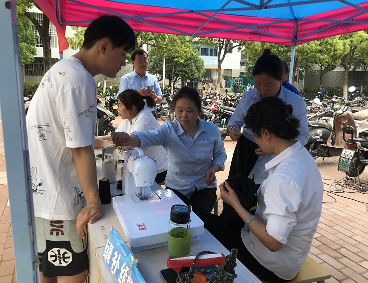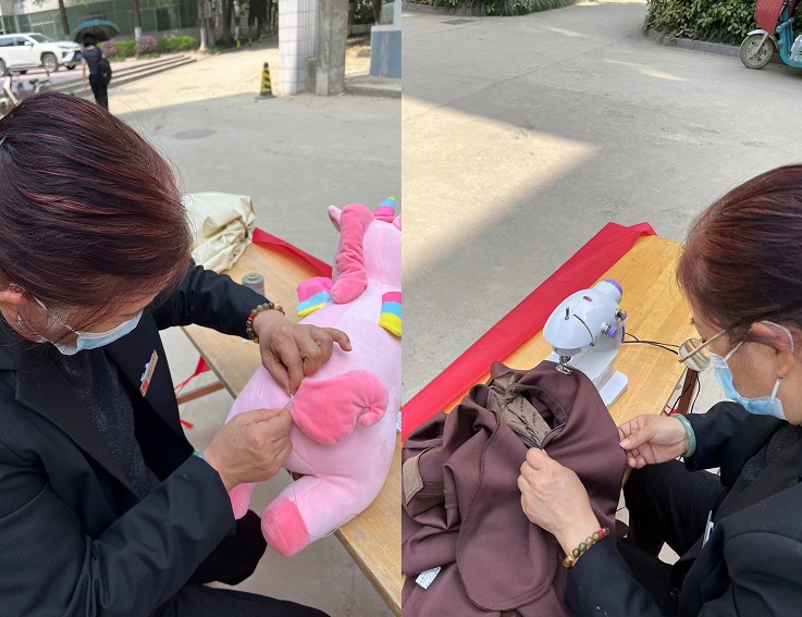 气温逐渐升高,当天上午工作人员早早就将接待的帐篷和桌子布置便已经安排妥当。十二点半刚到,便见有学生陆续来请求裁剪、熨烫衣物等,每个人的要求都不一样,有要求将裤子改窄一些的;有需要缝补长衫大褂的;有希望将自己衣服熨一熨的。面对学生们的诉求,物业的阿姨们和叔叔们认真负责,细致地解决处理难题。心灵手巧的阿姨们能让褶皱的衣服变得平整、让宽大的衣物变得合身。踏实朴素的叔叔修理着学生的自行车。一把折叠椅坏了,但到了物业维修服务台这里,只消一会儿功夫,便可将它恢复如初。