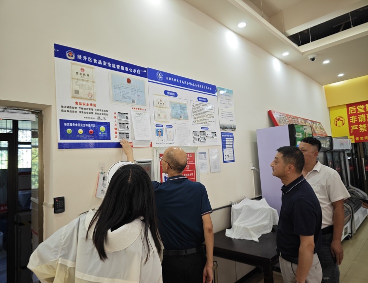本网讯 为进一步加强学校食堂食品安全监管工作,落实辖区包保责任制,保障学校师生饮食安全,9月1日,合肥经济技术开发区锦绣社区管理委员会城市管理部王克兵主任一行来到学校南区食堂,查看食堂开学前各项准备工作,集团饮食中心人员陪同。