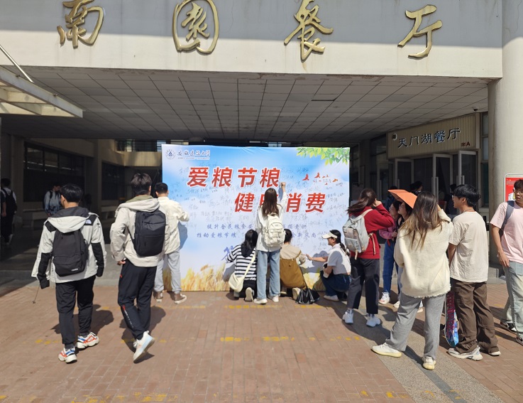 活动现场,同学们纷纷在签名墙上签名并合影,表示要成为“爱粮节粮、健康消费”活动的参与者、践行者、宣传者,用自己的实际行动来传承、弘扬勤俭节约的传统美德,并以自身行动影响带动身边人养成“厉行节约、反对浪费”的生活方式。