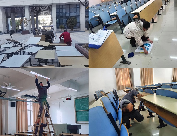 考试前夕,后勤管理处开展了考场内外环境及各类设施的检修工作。提前对考场的周边环境进行巡查,备用融雪剂、铲子等除雪设备,在易滑路段铺设防滑垫。安排专人认真排查课桌椅、照明、地砖、墙面、门窗、卫生间等设施,对教室、走廊、卫生间进行了全面彻底的清扫,调试了空调、电子钟、铃声、热水器等,以保障考试的顺利进行。此外,考试期间,提供徽学楼二层6间教室,供跨校区考生午休使用,并在各考场楼宇前设置暖心服务站,为学子们准备免费糖果、红糖姜茶、热水等,为考研学子驱散寒冷、加油打气。