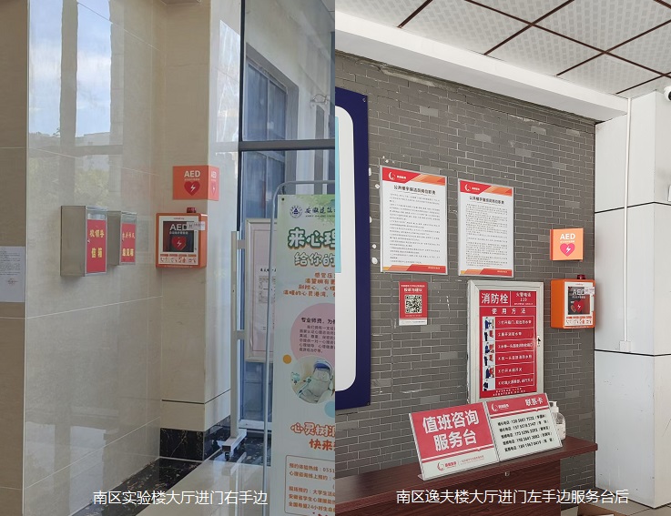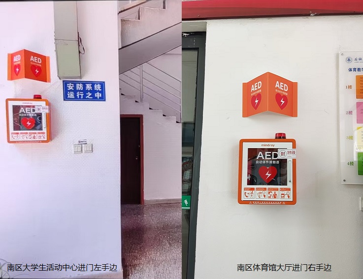 此次安装的AED设备分布在学校的体育馆、图书馆、实验楼、大学生活动中心等人员密集场所,共计5台(紫云路校区4台、金寨路校区1台)。这些设备均配备了清晰的使用说明和醒目标志,方便师生在紧急情况下能够快速找到并使用。AED作为一种便携式医疗设备,能够自动识别心脏骤停患者的心律失常,并通过电击除颤帮助患者恢复正常心跳,是抢救心脏骤停患者的重要工具。相关研究表明,在心脏骤停发生后的“黄金 4 分钟”内使用 ED进行除颤,患者的生存率可大幅提高。