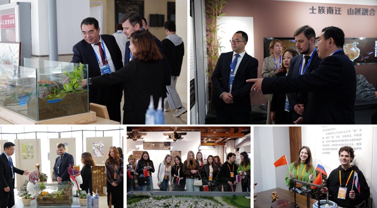 全体与会嘉宾挥舞中俄两国国旗共庆活动启动,并温馨合影。随后,与会嘉宾与师生代表共同参观了徽派建筑馆与建规学院学生作品展。此次参观不仅生动展现了徽州建筑的独特魅力,也充分展示了我校学子扎实的专业素养与创新实践,为工作坊后续“知行合一”系列活动奠定了坚实开端。