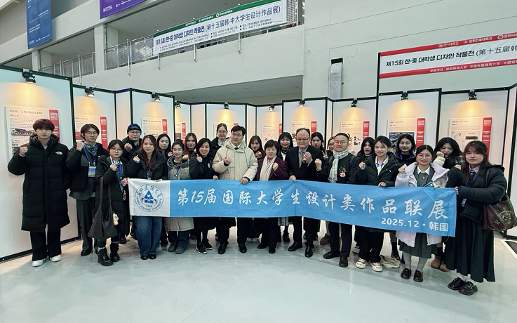 本网讯 12月3日至5日,第十五届中韩学生设计作品展在韩国韩瑞大学成功举办。该展览由我校与韩瑞大学、安徽理工大学联合主办,校党委副书记李早教授应邀带队参展。学生处、建筑与规划学院、设计与创意学院、机械与电气工程学院相关负责人员及19名设计类专业学生组成代表团,携19件优秀设计作品及6件实物模型展品赴韩开展交流活动。