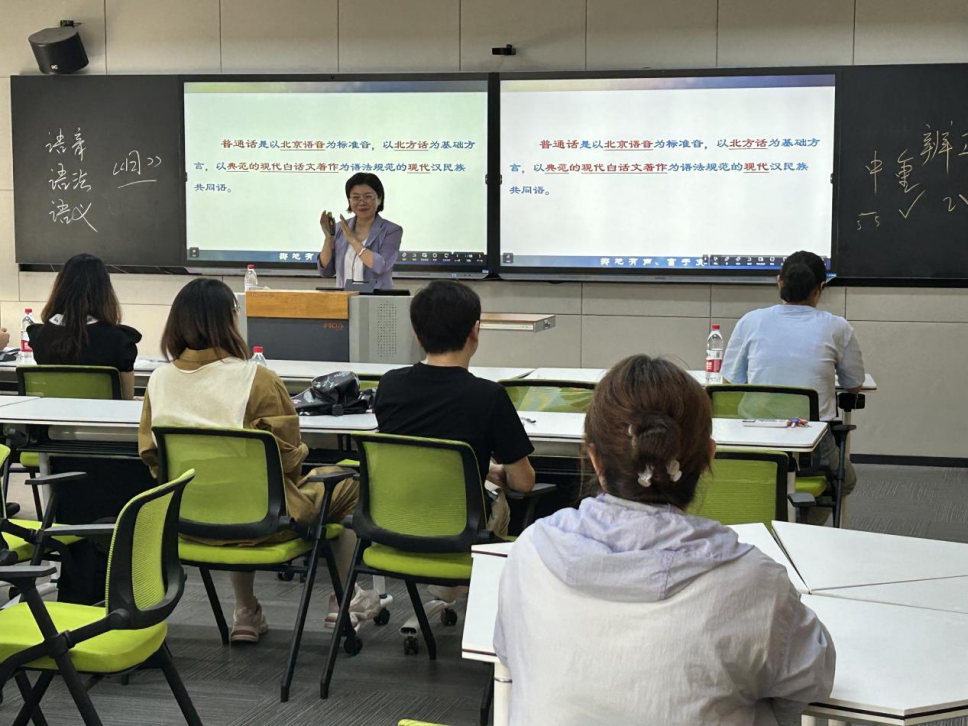 随后,陈静宇老师结合自己多年的教学经验,以语音语调为切入点,重点讲解了“平翘舌混淆”、“前后鼻音混淆”等常见的语音错误。陈静宇老师通过生动的案例和幽默的语言,将抽象的理论知识转化为易于理解和应用的实践技巧,使参会教师受益匪浅。最后,陈静宇老师向在场教师们介绍了普通话水平测试的内容,包括单音节字词、多音节字词、朗读短文和命题说话四部分,针对每部分测试内容提供了评分标准和备考技巧。陈老师认为讲好普通话的关键在于反复训练,只有辛勤的训练,才能保持普通话的流畅度。(作者:徐洁;一审:范晨晨;二审:胡大洋;三审:段宗志)