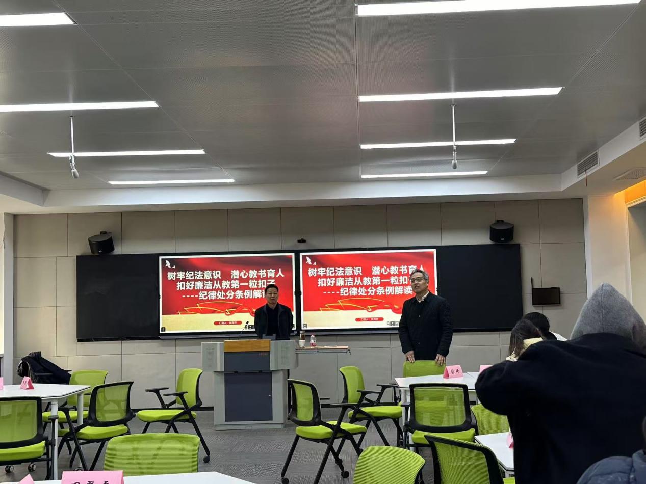 第二场培训由校纪委副书记、纪委办公室主任张兆许以“树牢纪法意识,潜心教书育人——党纪处分条例培训解读”为主题,为新入职教师们上了一堂生动的廉政廉教教育课。他强调,作为一名教师,不仅要具备扎实的专业知识和教学技能,更要树立牢固的纪法意识,做到廉洁从教、为人师表。张兆许主任还通过解读党纪处分条例,引导新入职教师们增强法纪观念,自觉抵制各种不正之风。