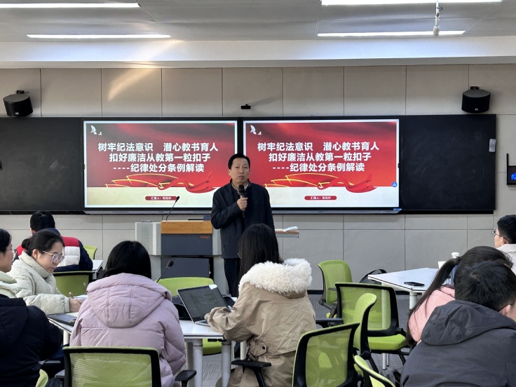 随后,纪委办公室主任张兆许作了题为“树牢纪法意识 潜心教书育人 扣好廉洁从教第一粒扣子——纪律处分条例解读”的专题报告。张兆许书记结合近年来教育系统典型案例,深入浅出地解读了《中国共产党纪律处分条例》及相关法律法规中与教师职业行为密切相关的条款。张兆许强调,教师肩负着立德树人的神圣使命,必须时刻绷紧纪律规矩这根弦,筑牢思想防线,守住行为底线。他指出,新教师要深刻认识廉洁从教的重要性,从一开始就要树立正确的权力观、地位观、利益观,做到清清白白做人、干干净净做事。