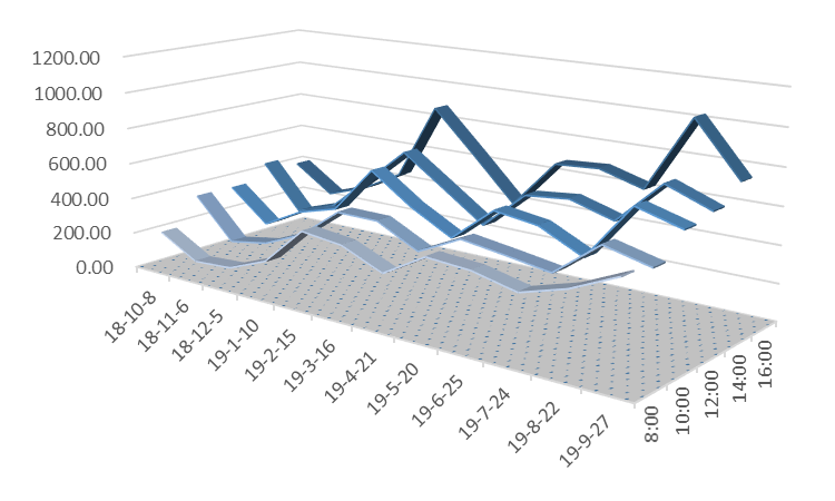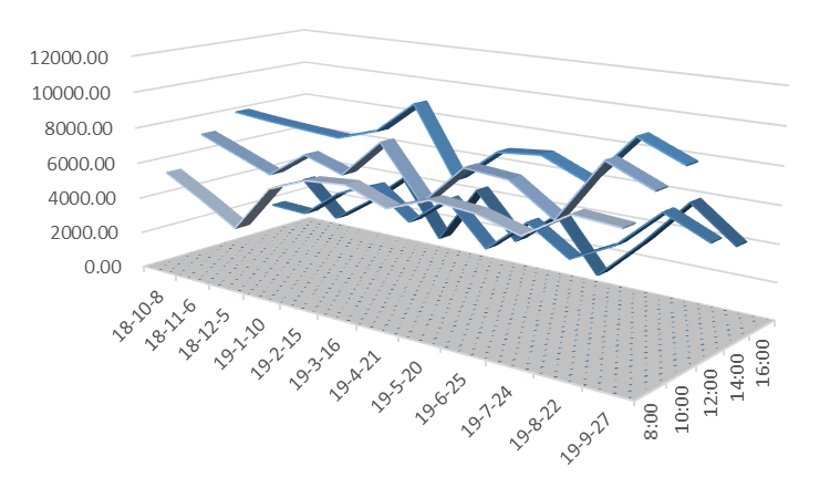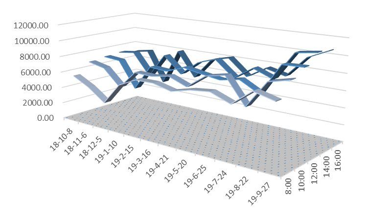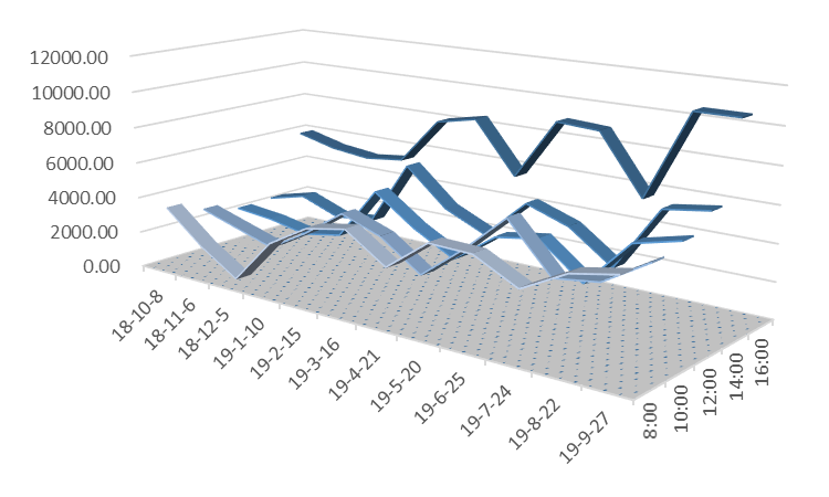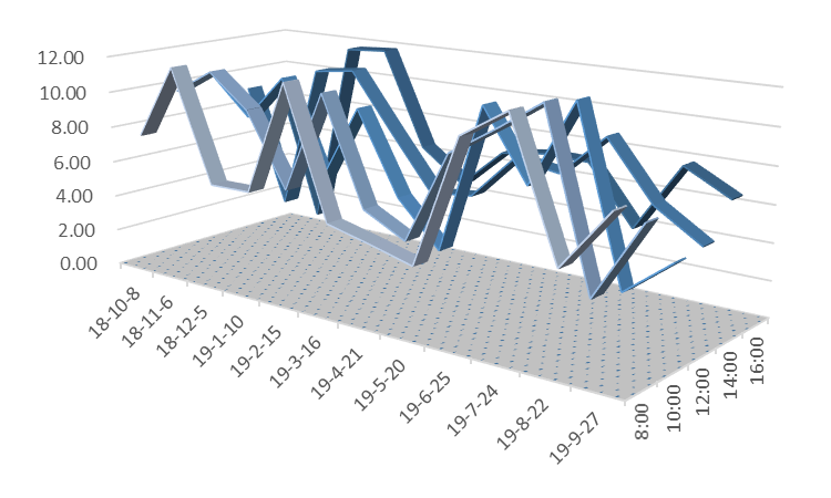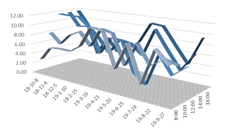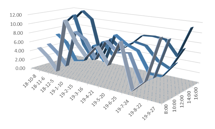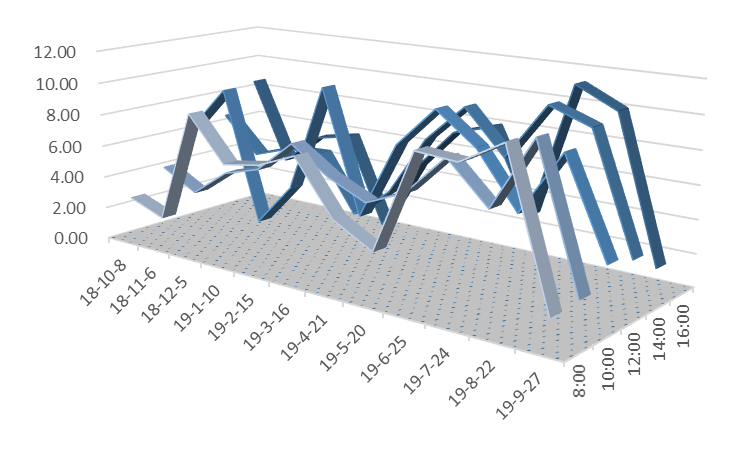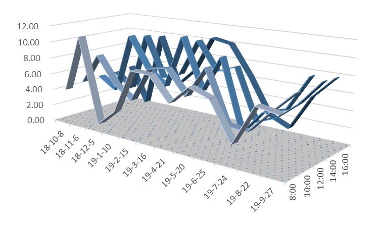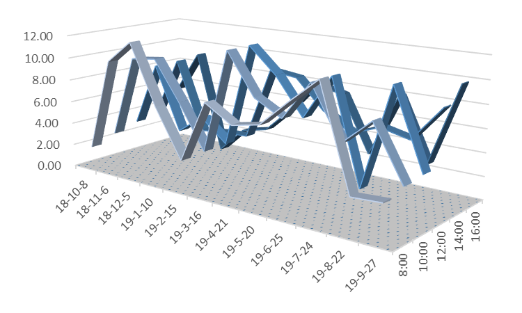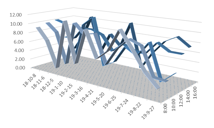说明:图5至图12三维带状折线代表风速值,单位为公里/小时;在所选的日期内,淮南市所有天气预报的风速值均为1-2级,对应的风速值应小于11公里/小时。