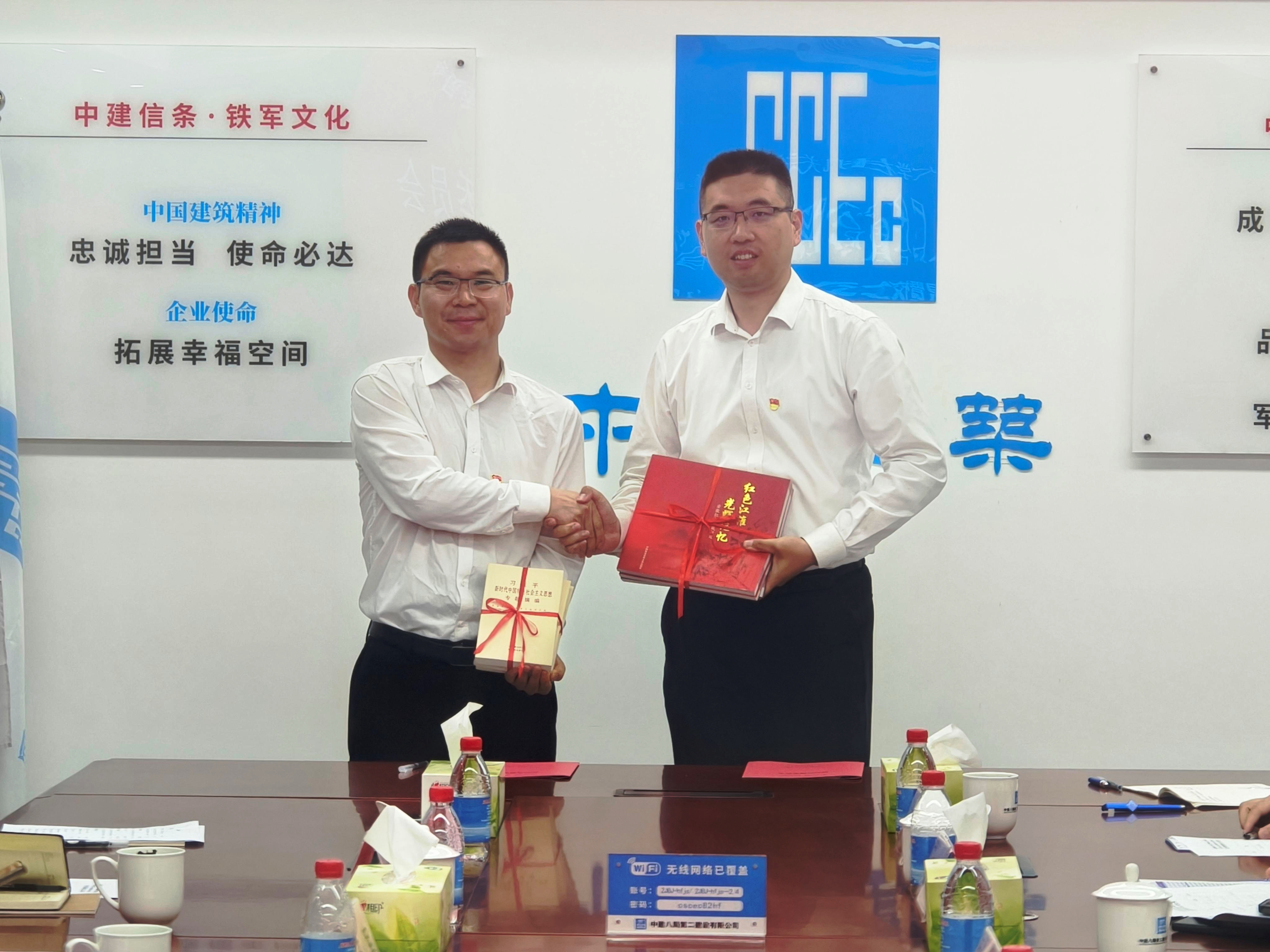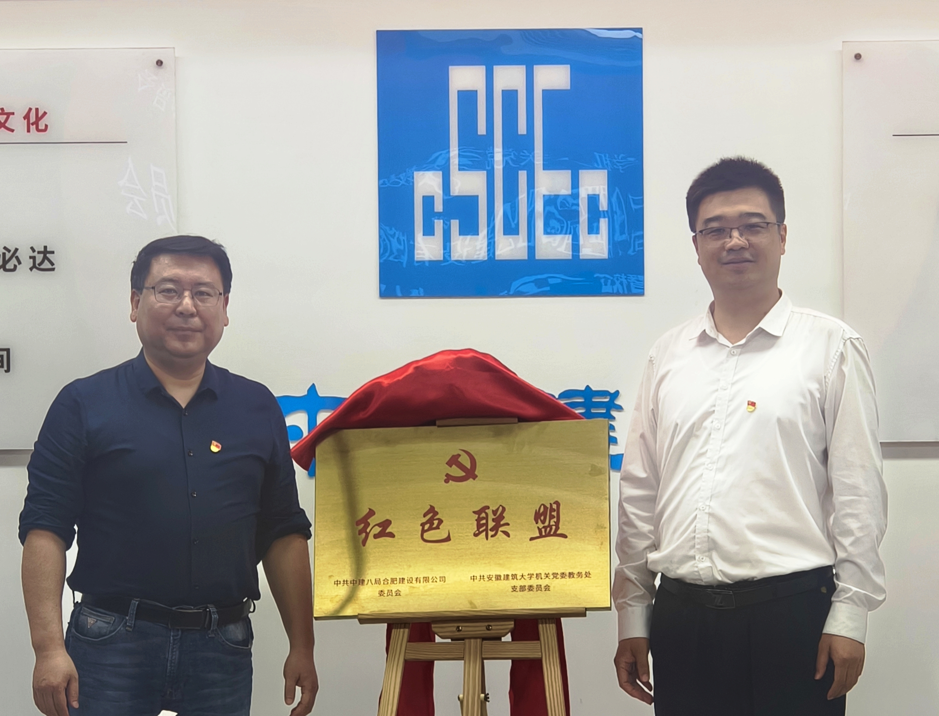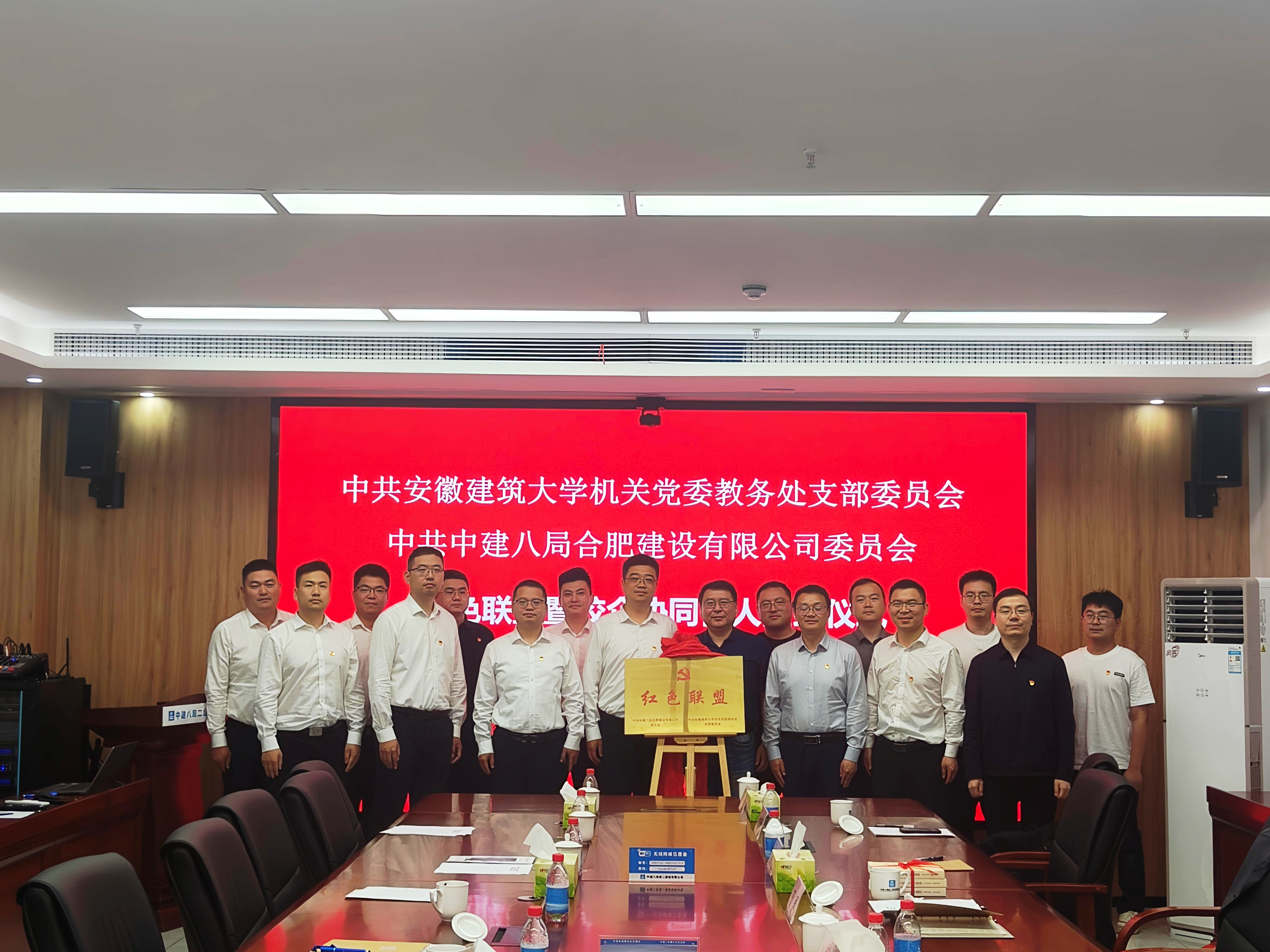 中建八局合肥建设有限公司党委书记、董事长丁晓冬代表企业热烈欢迎安徽建筑大学一行来访,介绍了公司发展历程、红色历史和近年来党建、发展各项建设成果。教务处党支部书记、处长马巍通报了学校共建各支部情况、党建工作现状和近年来校企合作发展举措,重点介绍了2025年首次达成的“校企合作班”“茅以升班”等校企、校地协同育人最新成果。活动期间,公司党委副书记、总经理高善友、教务处副处长王涛代表共建双方签署了“红色联盟”暨校企协同育人协议书,并共同为联盟揭牌。双方举行互赠红色书籍活动,教务处副处长丁超代表学校共建各支部向中建八局赠送了我校主编的《红色江淮 光辉记忆——安徽红色建筑印记》一书。