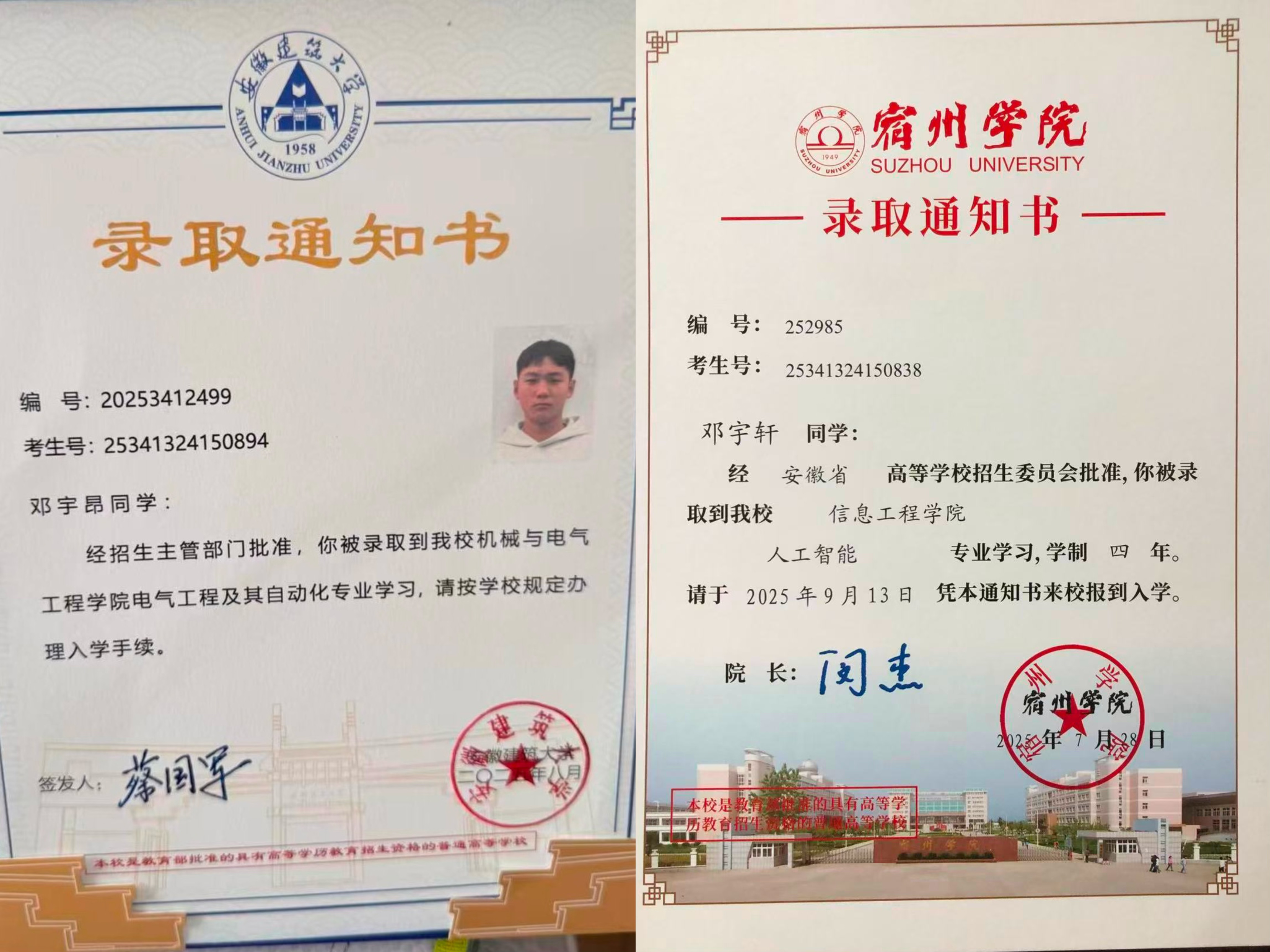 本网讯 今年学校迎新报到现场,有一对哥哥来送弟弟上学的双胞胎新生格外令人瞩目,他们是来自安徽省宿州市的邓宇昂、邓宇轩同学,2025年双双考上大学,分别录入安徽建筑大学电气工程及其自动化专业和宿州学院人工智能专业。两份录取通知书的背后,有着一段两校拓展合作交流模式、以校际联合招生宣传助力考生圆梦的佳话。