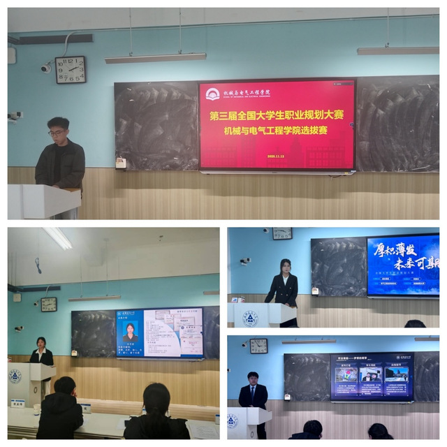 本网讯 为深入贯彻国家关于促进高校毕业生就业创业的重要部署,落实立德树人根本任务,强化生涯发展教育与就业指导实效。近日,机械与电气工程学院成功举办第三届全国大学生职业规划大赛学院选拔赛。本次比赛特邀合肥合锻智能制造股份有限公司管理中心主任、2006级机械专业校友倪欢欢,安徽行派户外用品有限公司总经理杜军和,校招生就业处就业指导科科长方健,马克思主义学院办公室副主任任亚若担任评审。学院党委副书记何鹤立出席比赛,2025级新生代表现场观摩。