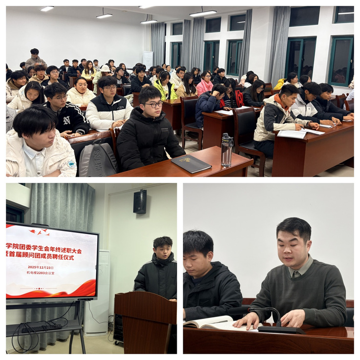 本网讯 12月23日,机电学院团委学生会在学院2203会议室召开2025年度年终总结大会暨顾问团成立仪式。会议以“凝聚共识谋发展,继往开来谱新篇”为主题,总结过去一年团委学生会工作成果,进一步展望未来发展,并举行机电学院团委学生会首届顾问团聘任仪式。学院团委副书记侯亚伟老师、学生会全体成员参加会议。