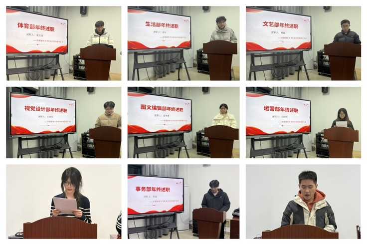 后续学生会各部门负责人依次上台进行年度工作述职,事务部、体育部、宣传部、生活部、文艺部、办公部、视觉设计部、图文编辑部、运营部九大部门围绕本年度工作成果、存在的问题与未来计划作了系统汇报,展现了各部门扎实的工作作风与鲜明的服务特色。主席团代表沈双双在发言中回顾了学生会在思想引领、活动组织、权益服务等方面取得的进展,并对全体成员的付出表示感谢。代表团委学生会表态,全体成员将继续秉持“服务同学、锻炼自我”的宗旨,不断加强自身建设,创新工作方法,更好地发挥桥梁纽带作用。