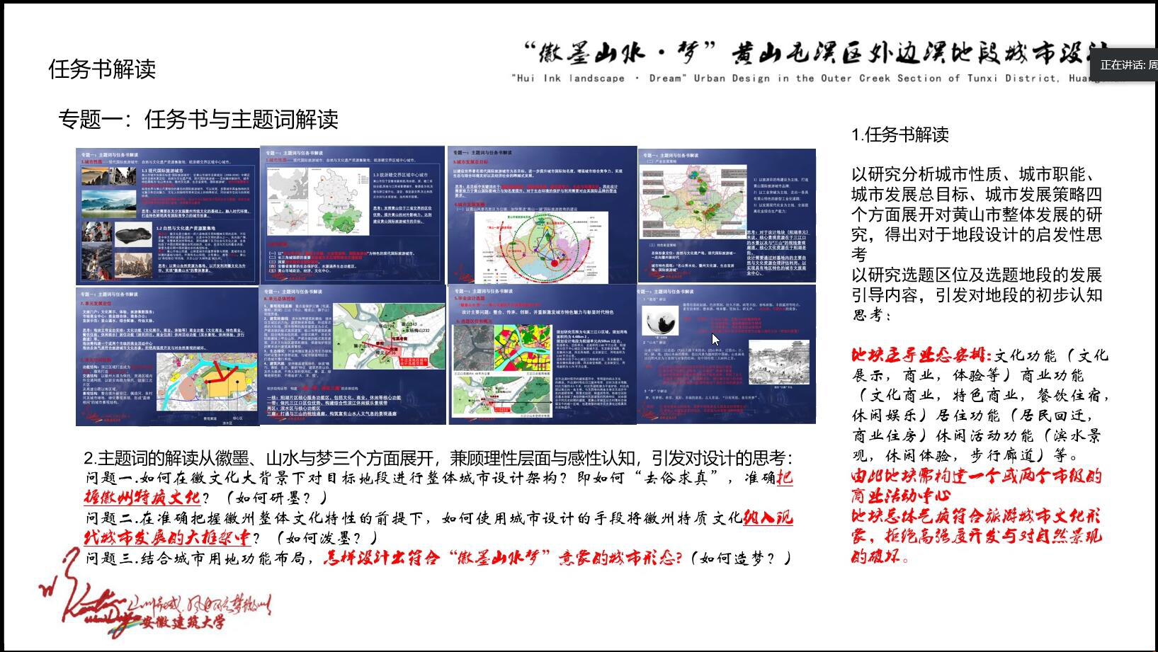 第十届“7+1“全国城乡规划专业联合毕业设计由安徽建筑大学建筑与规划学院主办,在疫情防控期间特殊时期,今年的联合毕业设计采用了线上教学的方式,按既定目标计划有条不紊的组织和推进。4月18日,项目组张磊等老师对学生们联合毕业设计中期成果进行线上交流和指导。此次联合毕业设计总参加的学生有67人,指导教师有18人,分成27个设计小组合作设计《徽墨山水·梦——黄山市三江口外边溪滨水地段城市设计》课题。