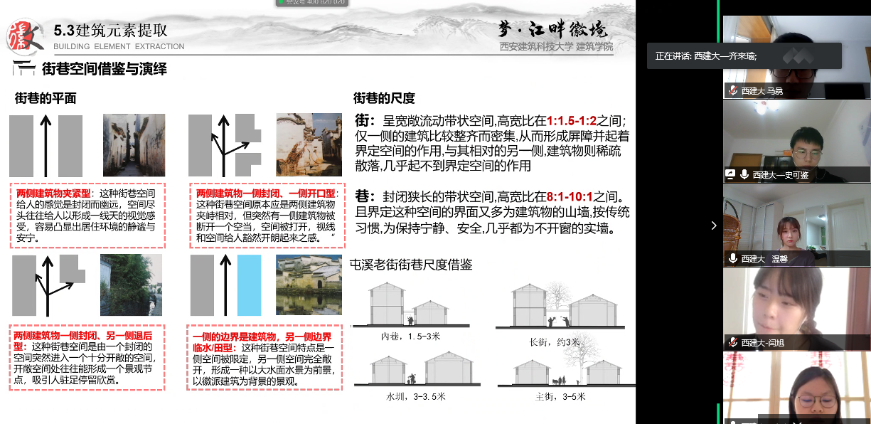 为充分教学交流与指导联合毕业设计中期成果,在线会议分成3个会场进行讨论。每组同学的汇报表达内容丰富,基础资料收集和分析较为详实,课题分析的视角也比较十分多样,大家能积极利用互联网资源收集各类文献资源,展开“非现场调研”为将来的课程设计带来一些新的探索,受到指导教师们一致好评。教师在表扬各组成果优点的同时,也提出建设性意见和改进具体内容,帮助同学们深化、完善毕业设计成果,同时也解答规划过程中的各种疑惑,受到学生们一致好评。由于时值周末,在线会议也吸引了不少联合高校规划专业三四年级的学生前来观摩学习,会后大家积极留言讨论。现场讨论交流的气氛比较活跃,同学们的积极提问,充分体现了同学们对本次联合教学活动的热情。