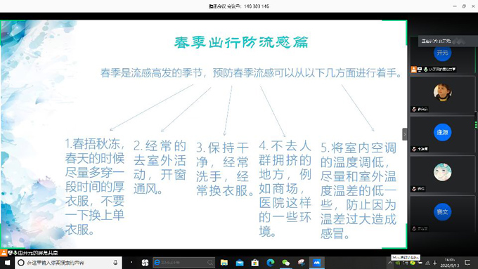 分享会向同学们普及了交通安全、饮食卫生等安全常识,重点强调了春夏季节交换防传染病、防溺水、防雷击相关安全知识。学生会倡议同学们注意个人卫生,劳逸结合、按时作息,加强体育锻炼,增强免疫力。