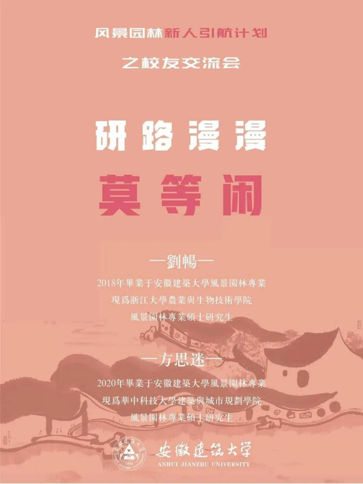 本网讯 10月16日晚,2020年风景园林专业“新人引航计划”第二场“研路漫漫莫等闲”分享会在建筑馆中庭展开。毕业于安徽建筑大学风景园林专业的刘畅和方思迷两位同学受邀担任此次分享会的分享人。刘畅同学现为浙江大学农业与生物技术学院风景园林专业硕士研究生,方思迷同学现为华中科技大学建筑与城市规划学院风景园林专业硕士研究生。景观系系主任聂玮老师、李罡老师、王敉敉老师及2020级风景园林专业全体新生参加次此活动。18级风景园林朱志扬担任此次分享会主持人。