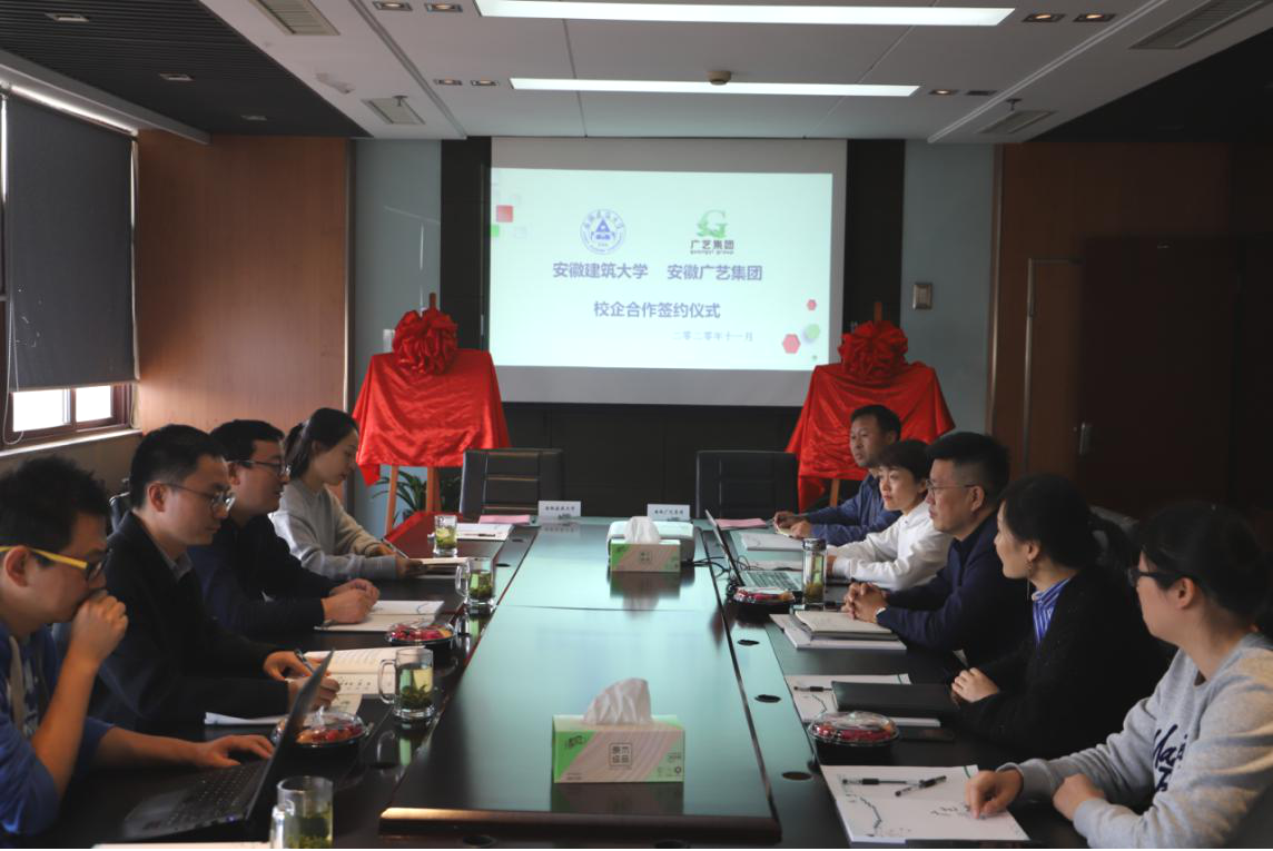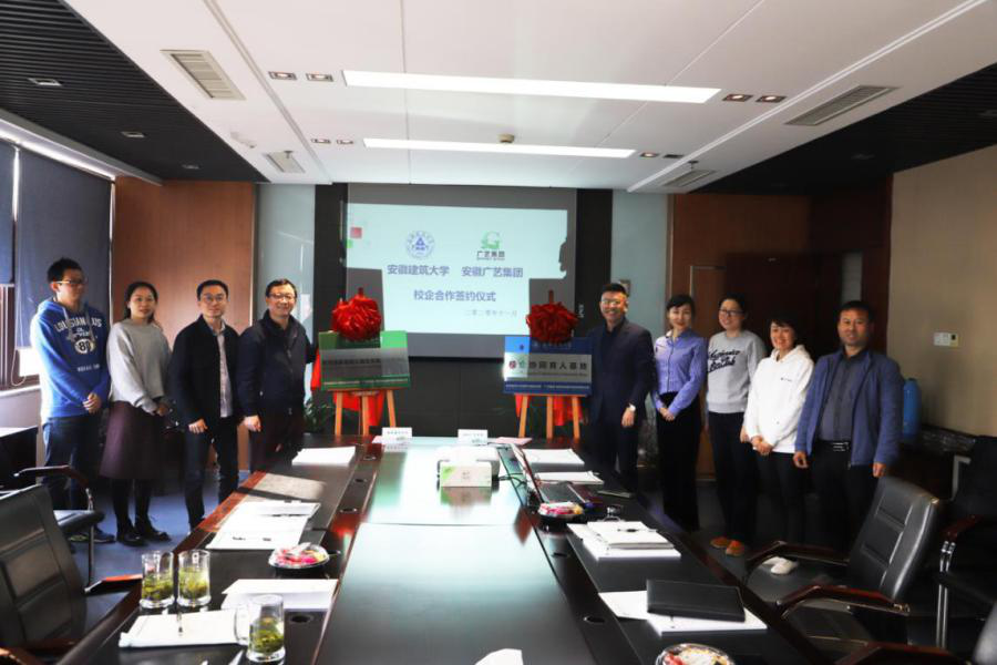 本网讯 11月13日,安徽建筑大学建筑与规划学院、安徽广艺集团校企合作签约仪式在合肥举行。建筑与规划学院院长吴运法、景观系系主任聂玮、广艺集团董事长杨卫东等出席活动。