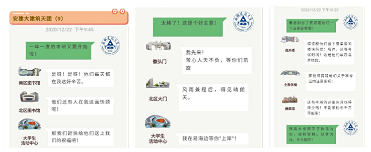 安徽建筑大学“校徽”带领南北校区各座“建筑物”,为建大2021年考研学子送上最真挚的考研祝福和最贴心的温馨提示。