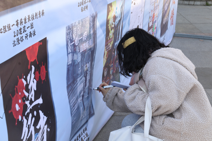 展览现场热闹非凡,气氛活跃,过路的师生纷纷接过现场工作人员提供的笔,在2020这非凡的一年的最后一天为自己最喜欢的海报投票,选出他们认为最使他们感动的海报。