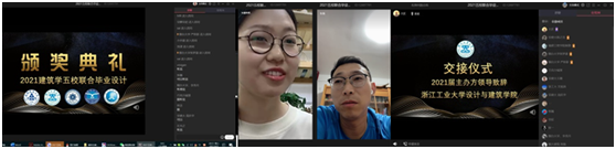 当晚还进行了线上颁奖晚会,王薇副院长做了总结发言,学生代表谈了本次设计的感想,老师们也对即将踏入新的学习环境与工作岗位的同学们提出了宝贵的未来发展建议。最后晚会还就下一届联合毕业设计安排作了交接仪式,浙江工业大学系领导做了交接发言。至此,本次全国建筑学“5+1”联合毕业设计答辩及汇报交流会圆满落下帷幕。