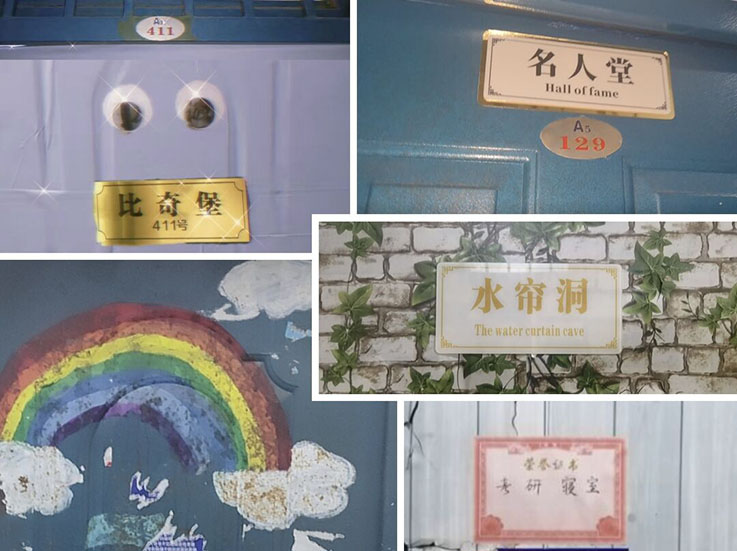 斯是陋室,为吾德馨。门,既是房屋的外檐装修,又是独立的构筑物,占尽了出入口的区位优势,总是引人注目的。作为展现寝室文化的开端,各寝室大显神通,利用各式墙纸和标牌打造着各自的专属宿舍门。