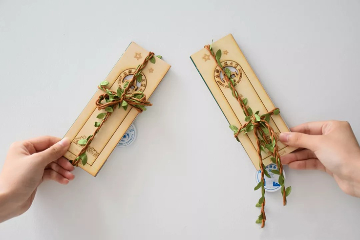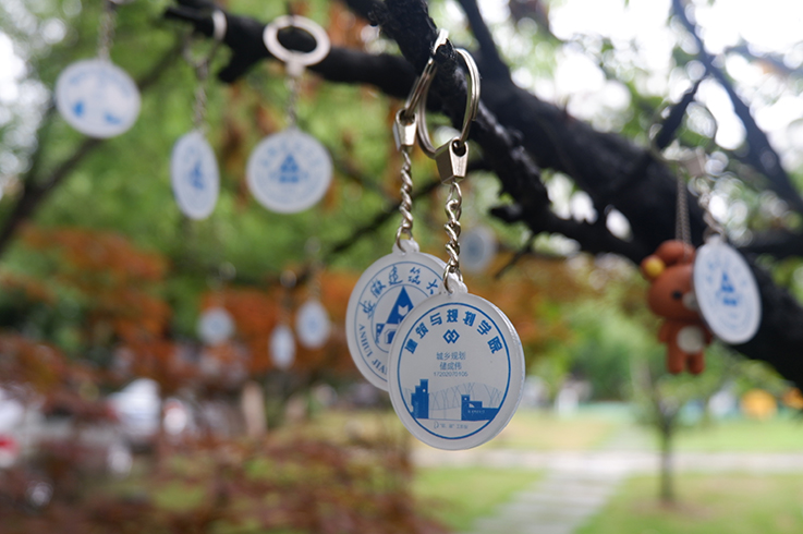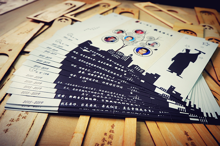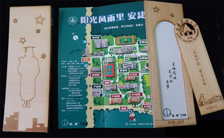 2019届风景园林专业毕业礼物是“聚火散星”套装,聚是一团火,散是满天星。正面印有校徽、校训、校园建筑、反面印有专业、学号、姓名的安徽建筑大学私人订制版书签,正面是记录成长轨迹和师长寄语、反面是北校区手绘地图的纪念折页,正面是校徽、反面是学院、专业、姓名、学号的个性挂件,用藤条麻绳将书签、折页、挂件组合起来,寓意毕业时已将学校、班级、个人、成长融为一体。聚是一团火,散是满天星,愿历尽千帆,归来仍少年。