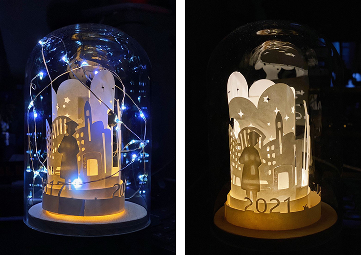 2021届风景园林专业毕业礼物是“归于林下”纸雕。采用代表进德、弘毅、博学、善建校训的不同颜色的信封,点缀着自刻橡皮章寄语、模型经典材料干花和特殊的火漆章封印。一张2017-2021年剪影、一张初入校园到学有所成剪影、一张北区大门与建筑馆的剪影、一张寓意在党的百年光辉下成长的66位毕业生剪影,根据使用指南,每位同学可以自行DIY制作纸雕。珍惜每一分与你们同行的时光,诸事皆宜,未来可期。